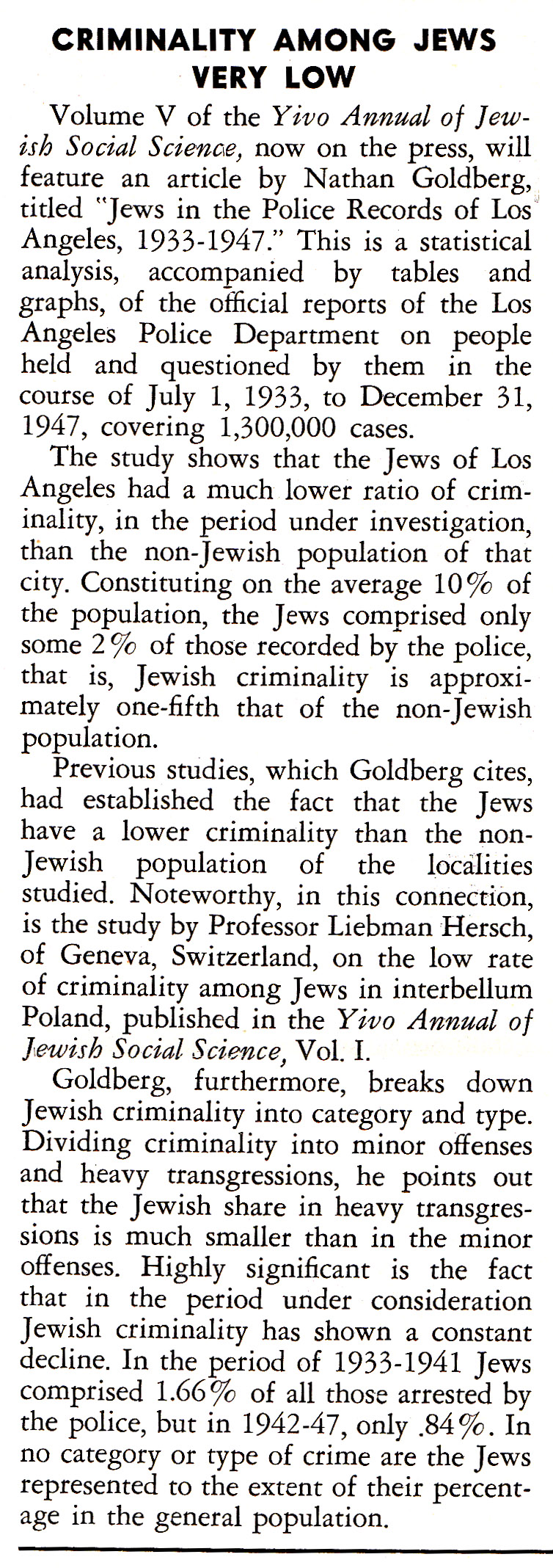 While there is plenty of Jewish anxiety these days about Jews associated with Wall Street scandals and financial scams (e.g., Bernard Madoff’s Ponzi scheme), attention paid to Jewish perpetrators of non-white-collar crimes is considerably less common. Not so, it seems, in September 1950, when this item, “Criminality Among Jews Very Low,” appeared in Yedies.